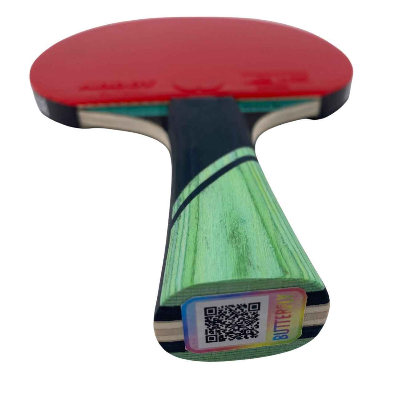 In partea de jos a manerului se afla un autocolant holograma, o dovada pentru autenticitatea paletei. In plus, autocolantul are Cod QR care ofera informatii interesante despre Butterfly si gama tenis de masa.