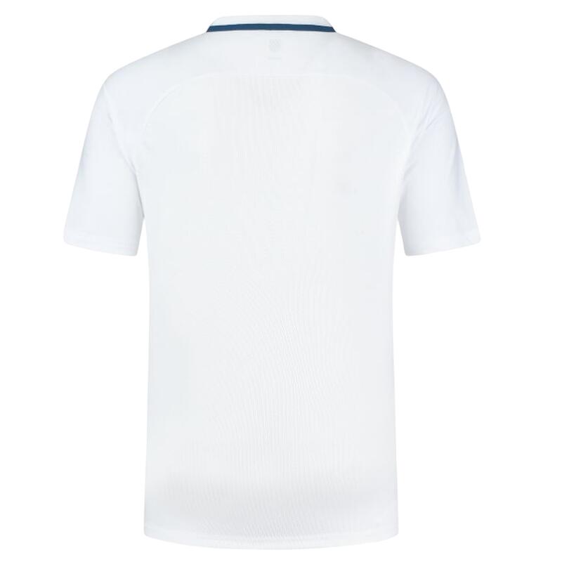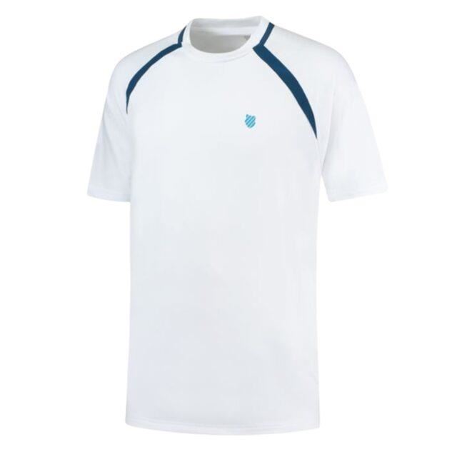 Are maneci raglan cu insertii contrastante in fata, un detaliu cu dungi pe gatul din spate, un panou de plasa tonal respirabil pe spate, performanta de absorbtie a umezelii si logo-ul scutului K-Swiss pe piept din stanga.